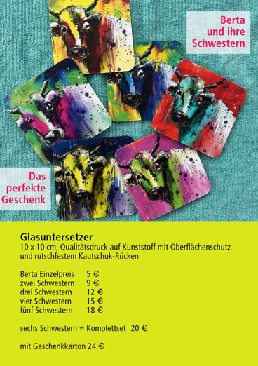 Das ideale Geschenk oder als Mitbringsel für die nächste Einladung. Die Motive sind ein Ausschnitt aus meinen Bildern, zum Teil mit Themen und Sprüchen ergänzt. Oder auch - für Kuhfreunde - Berta & ihre Schwestern.